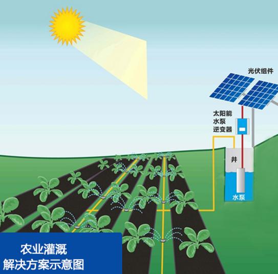 太陽能農(nóng)業(yè)灌溉系統(tǒng)主要由水泵、太陽能水泵逆變器、光伏組件,及灌溉設(shè)備構(gòu)成。該系統(tǒng)利用太陽能發(fā)電驅(qū)動(dòng)水泵提水來替代傳統(tǒng)的柴油及市電灌溉系統(tǒng)。整套系統(tǒng)安裝方便可靠,節(jié)能環(huán)保、高效??梢詰?yīng)用在山區(qū)、村莊、農(nóng)田、果園、花圃園林等。