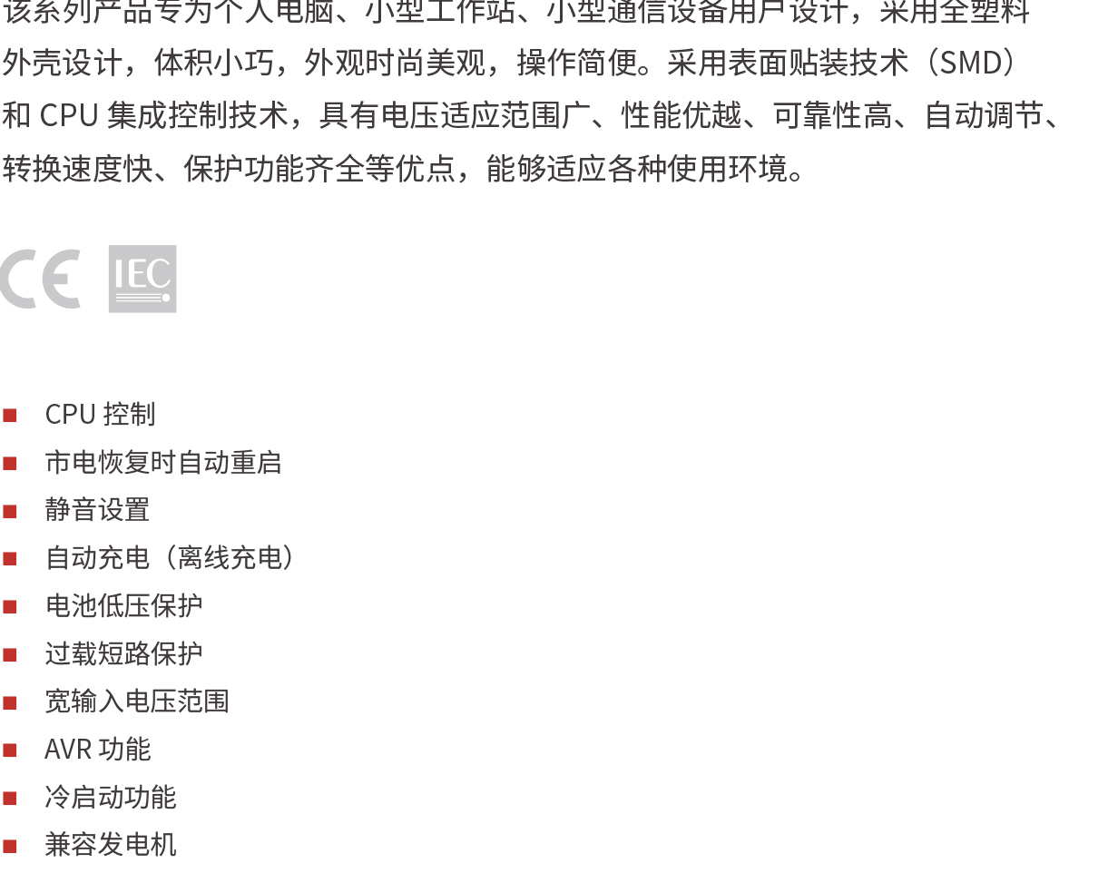 - 具有交流輸入過、 欠壓保護(hù), 輸出過載保護(hù)、短路保護(hù)、溫度保護(hù)、 電池欠壓預(yù)警保護(hù)和電池過充保護(hù)等。